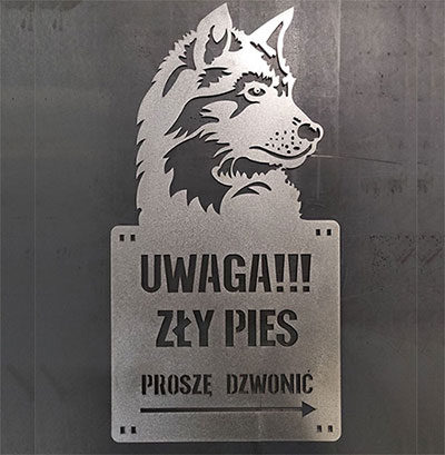 Tabliczka ostrzegawcza na bramę/furtkę. Wykonana ze stali nierdzewnej o grubości 2mm. Posiada otwory montażowe.