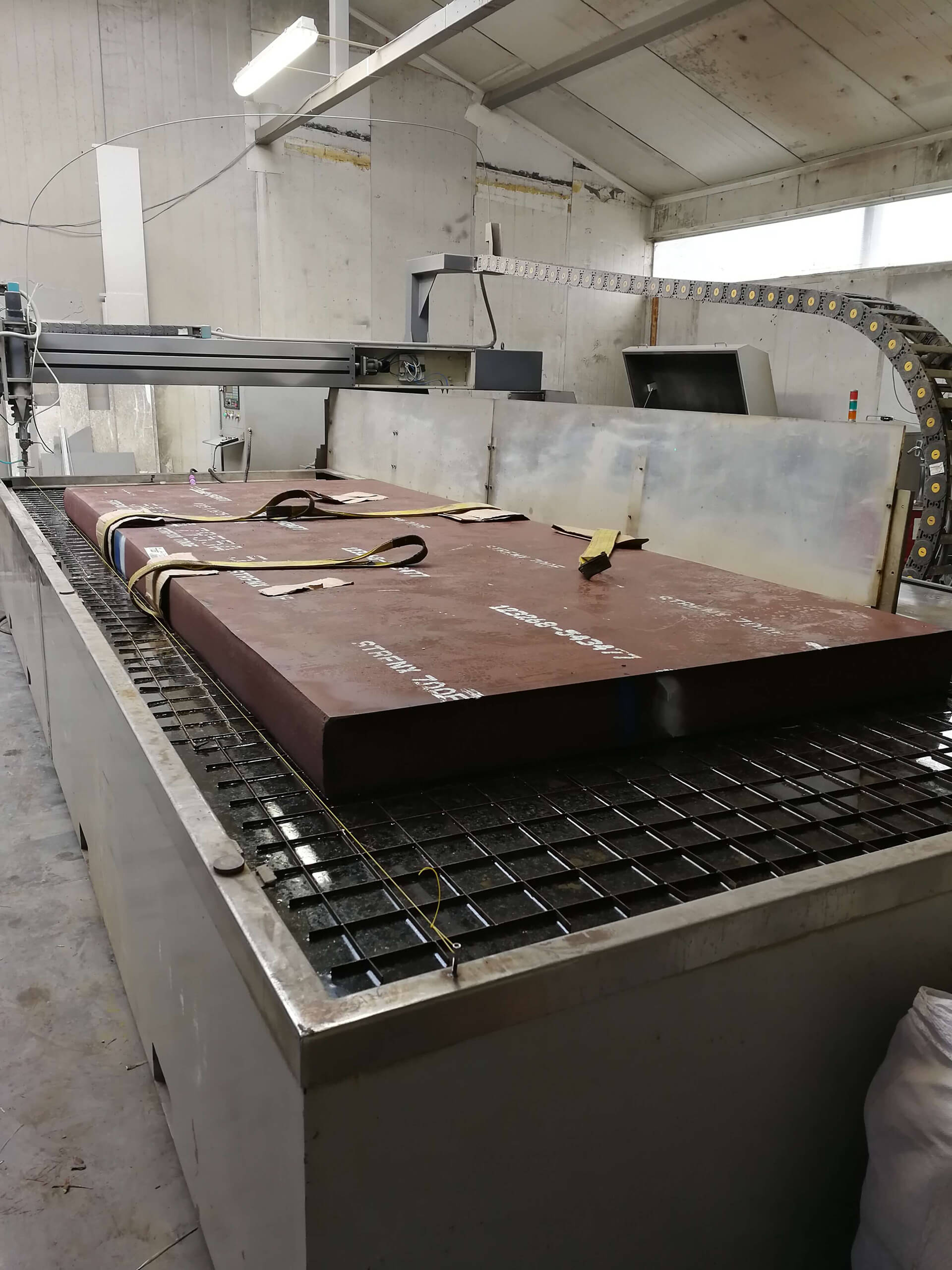 Do wycinania skomplikowanych kształtów używamy technologii Waterjet. Jest to technologią cięcia różnych materiałów przy użyciu cienkiego strumienia wody lub mieszanki wody i ścierniwa pod wysokim ciśnieniem. Cięcie przy użyciu czystej wody jest stosowane do obróbki delikatnych materiałów takich jak jedzenie lub guma. Mieszanka wody i ścierniwa jest jest stosowana do twardych materiałów takich jak granit lub metal.